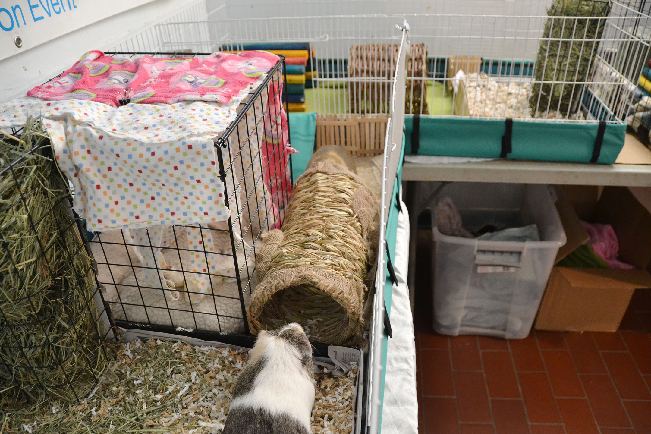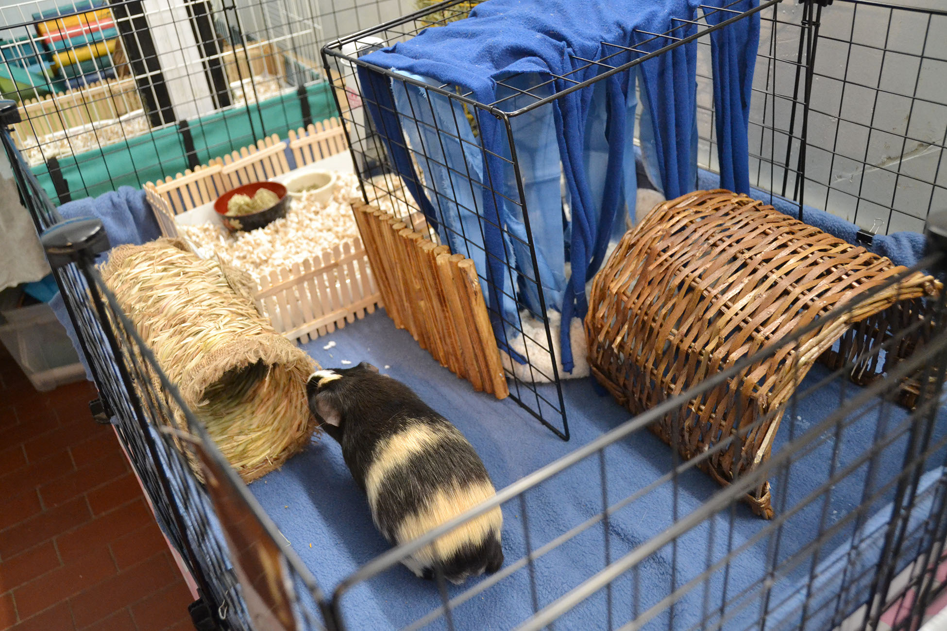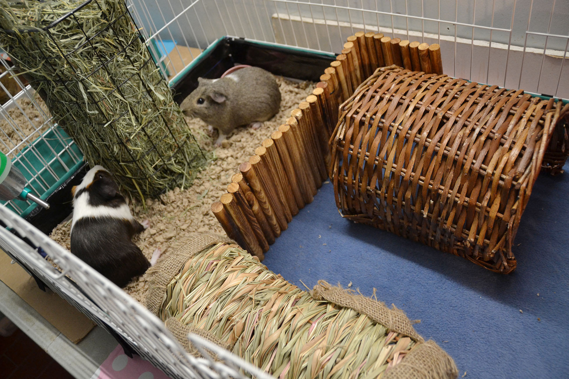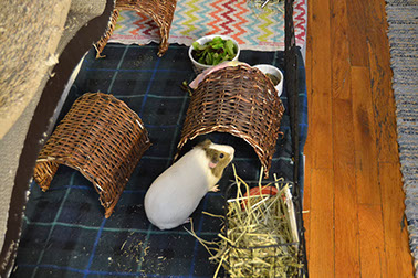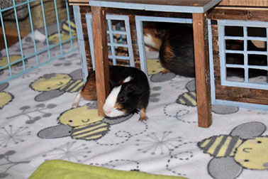Place the enclosure in an area away from drafts or direct sunlight. It is also advisable to house the piggies in an open area rather than in a bedroom; housing them in a bedroom could disturb sleeping humans or lead to allergies due to the dust that bedding and/or hay often carry. Provide huts or boxes for the piggies to hide, as well as toys and soft surfaces for them to rest on. Make sure that there is no exposed metal where their feet can get caught and result in injury.