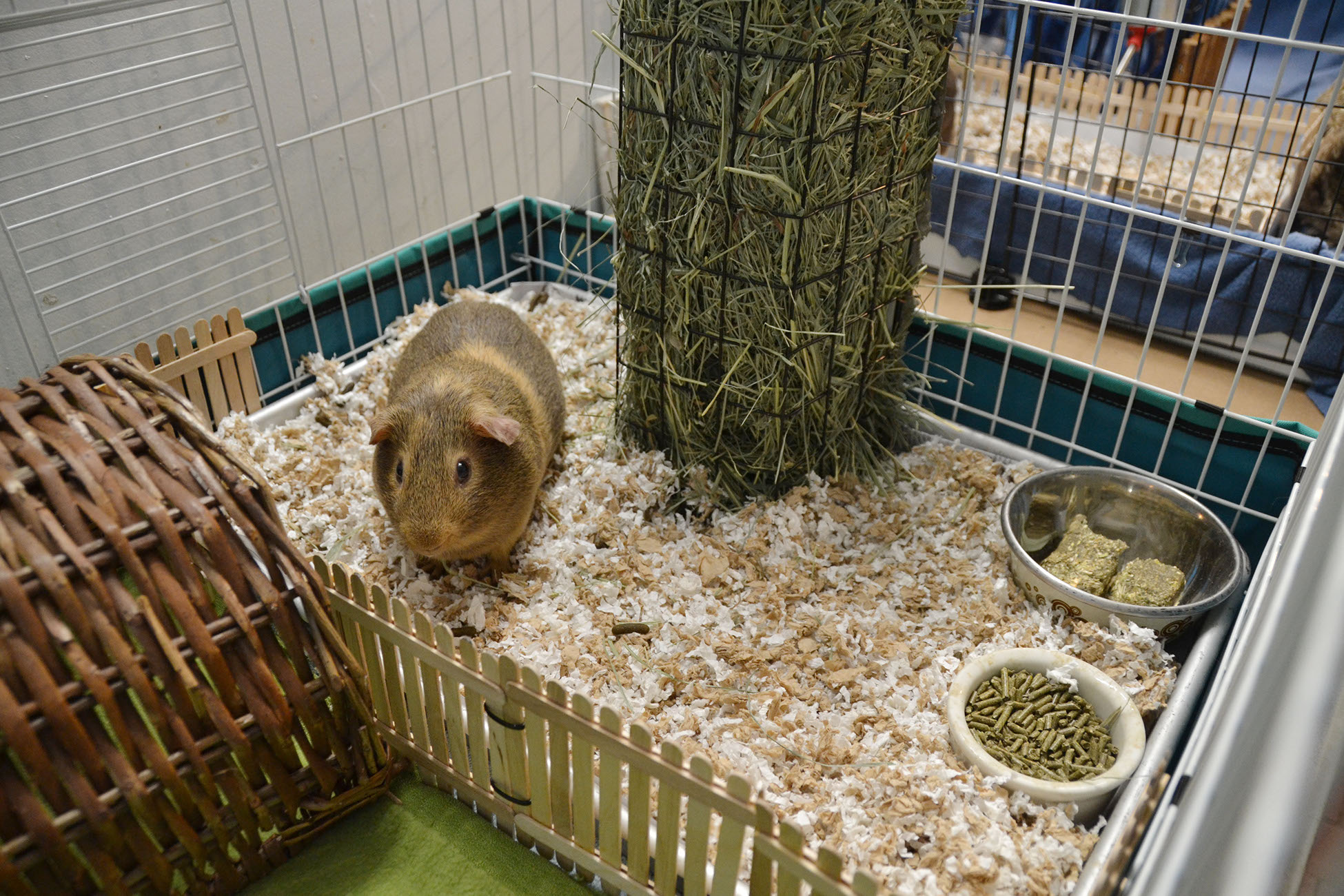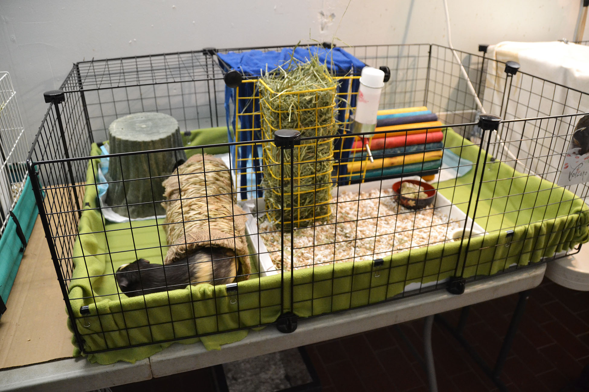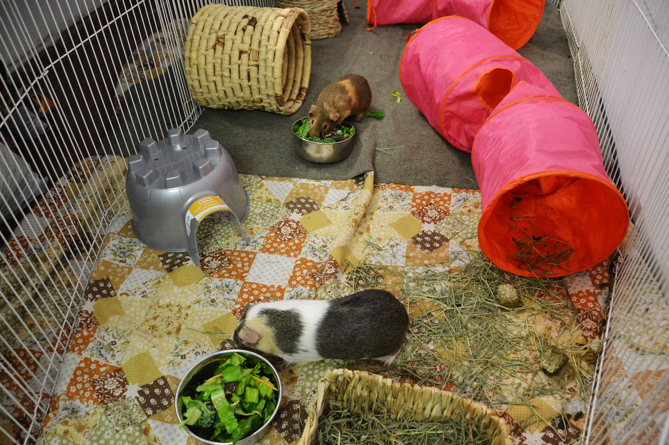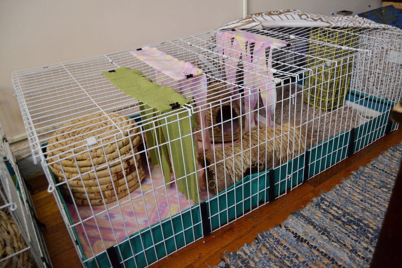 Cages sold at the typical pet store tend to be too small and, therefore, inappropriate for guinea pigs. If you have the space, choose a C&C cage or a MidWest cage. We recommend to use a MINIMUM 6 squared feet for a guinea pig (a 2x3 C&C cage) and to add 2-4 squared ft per additional guinea pig. Ideally, a female pair should have around 10 squared ft of space, and a male 12 squared ft. Adding different levels to the shared cage provides a fun activity for the human, as well as happy guinea pigs! And, always keep in mind- the larger the cage, the better.