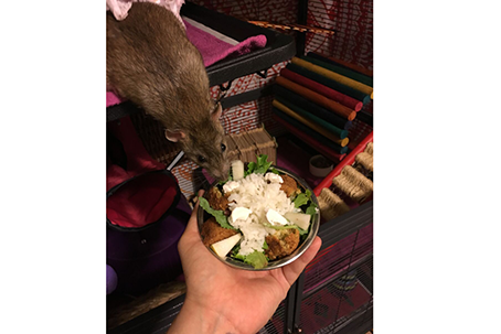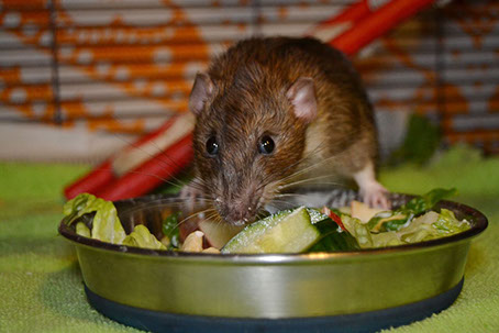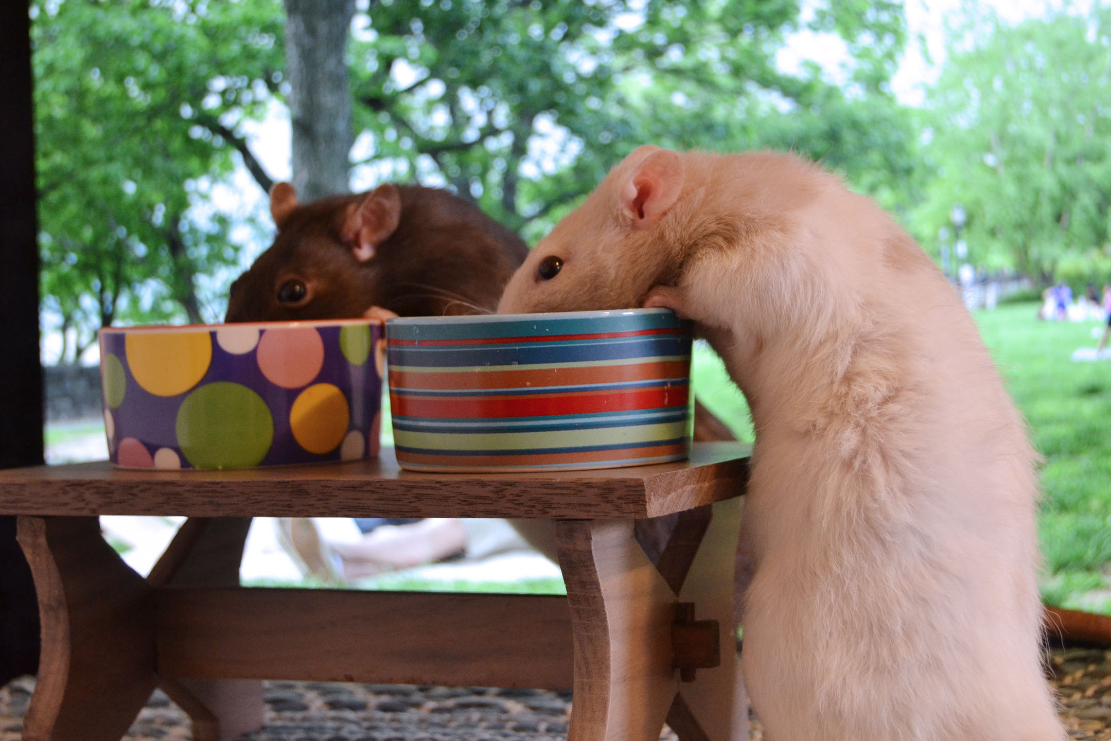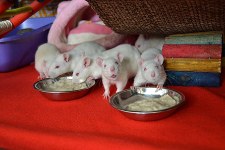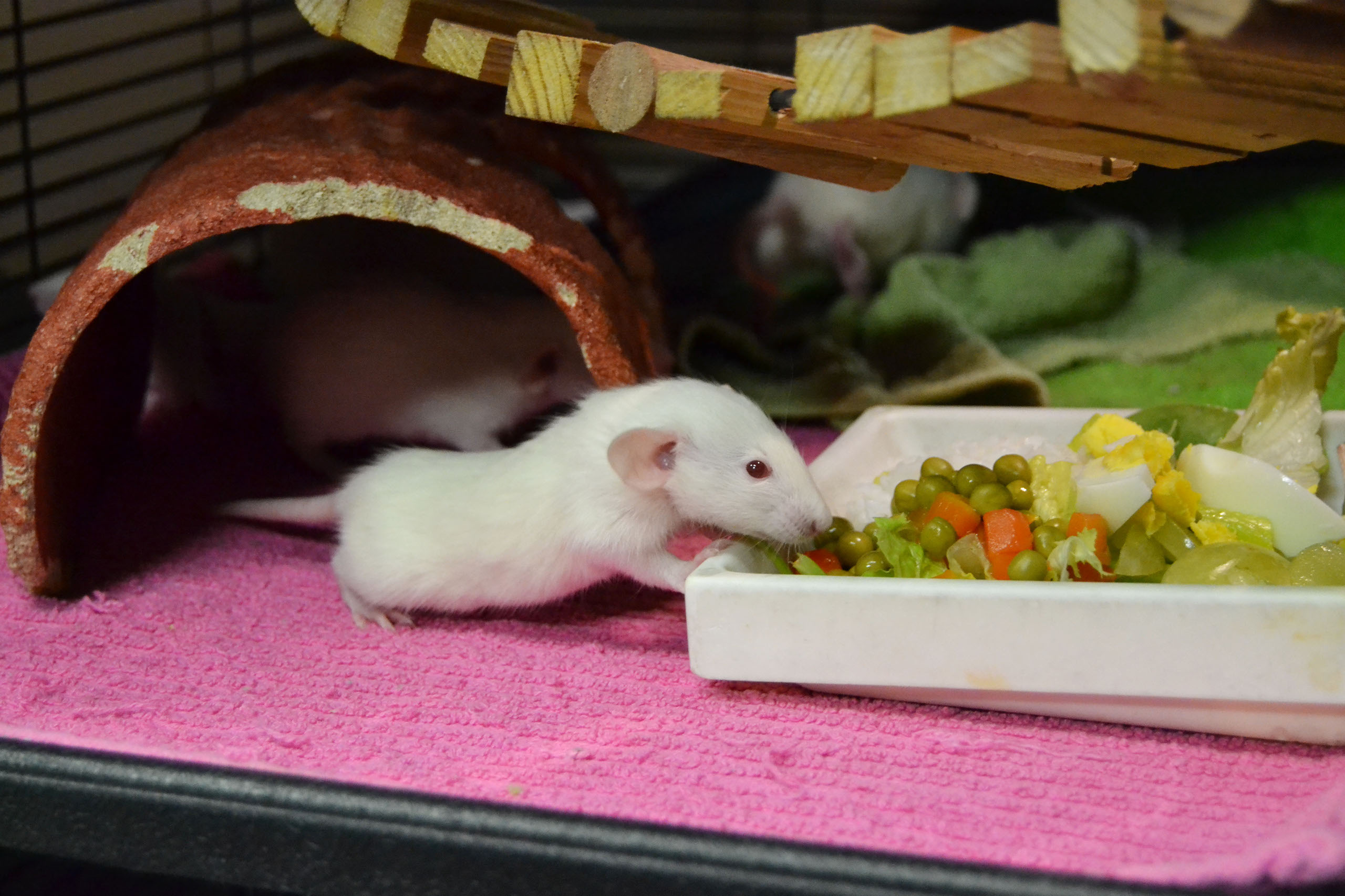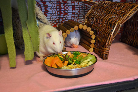 The ratties’ primary food source should be a good lab block/pelleted food (such as Oxbow Rat food), supplemented with daily cooked and fresh veggies, legumes, beans, rice, pasta, leafy greens, and occasional fruits. We believe that VEGAN DIET is not only morally consistent for us, and our fellow omnivores, but also vital for rats’ wellbeing and overall health. Today animal derived foods are too stained with hormones, pesticides, antibiotics and steroids (see our Vegan For the Animals pages for more info!) and are to be avoided all together. Even if not harmful due to many additives and chemical preservatives (that are impossible to avoid), animal derived foods are simply not a necessity. Well planned vegan diets are nutritionally adequate and may provide health benefits in the prevention and treatment of certain rat diseases (such as tumors and cancer).