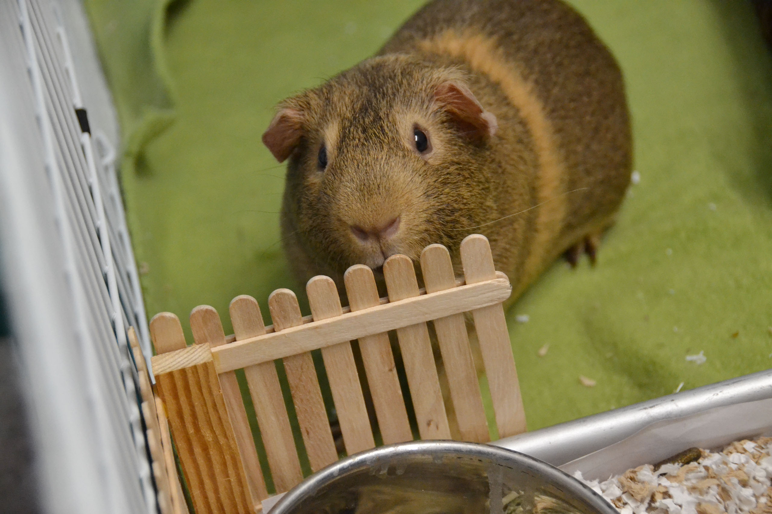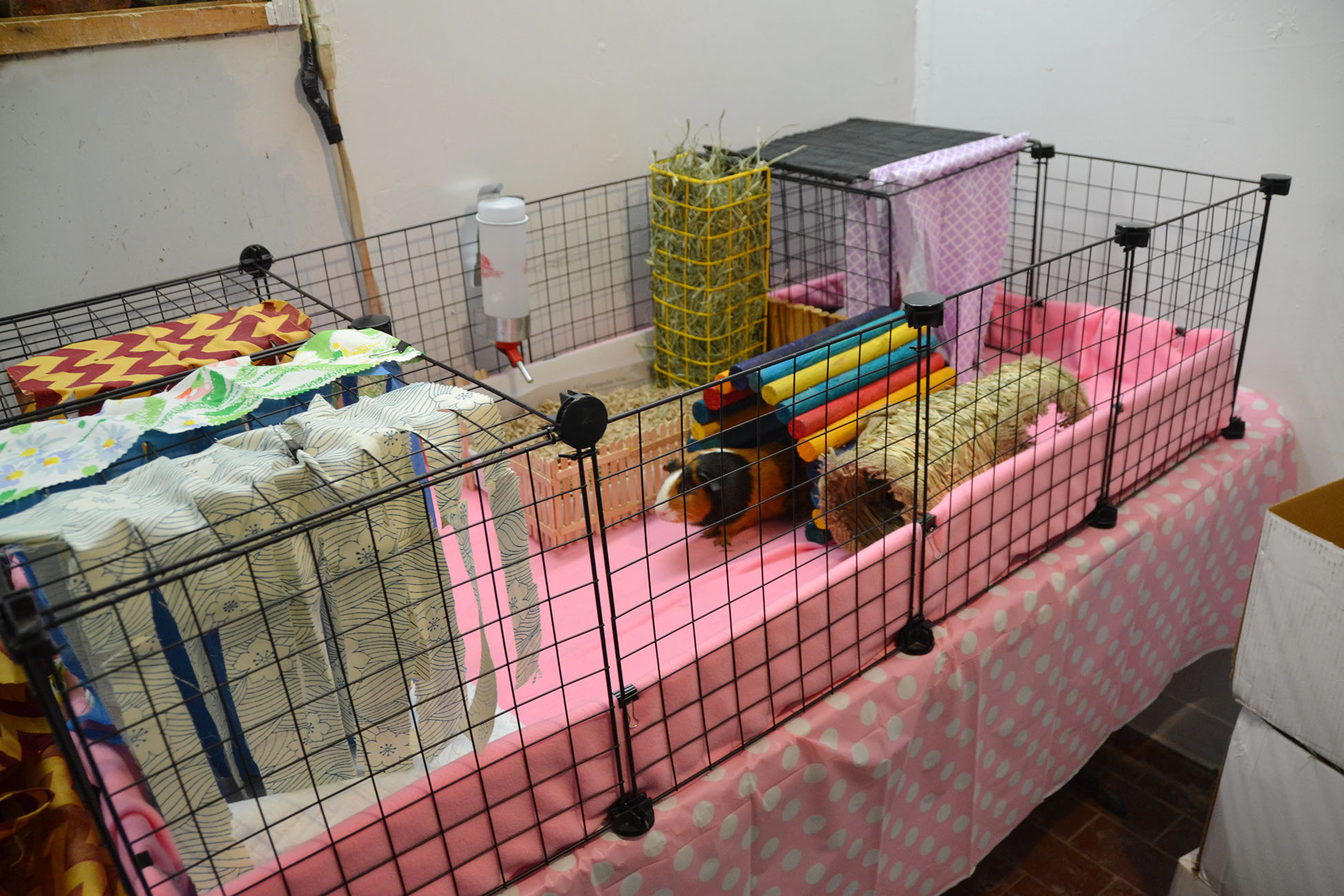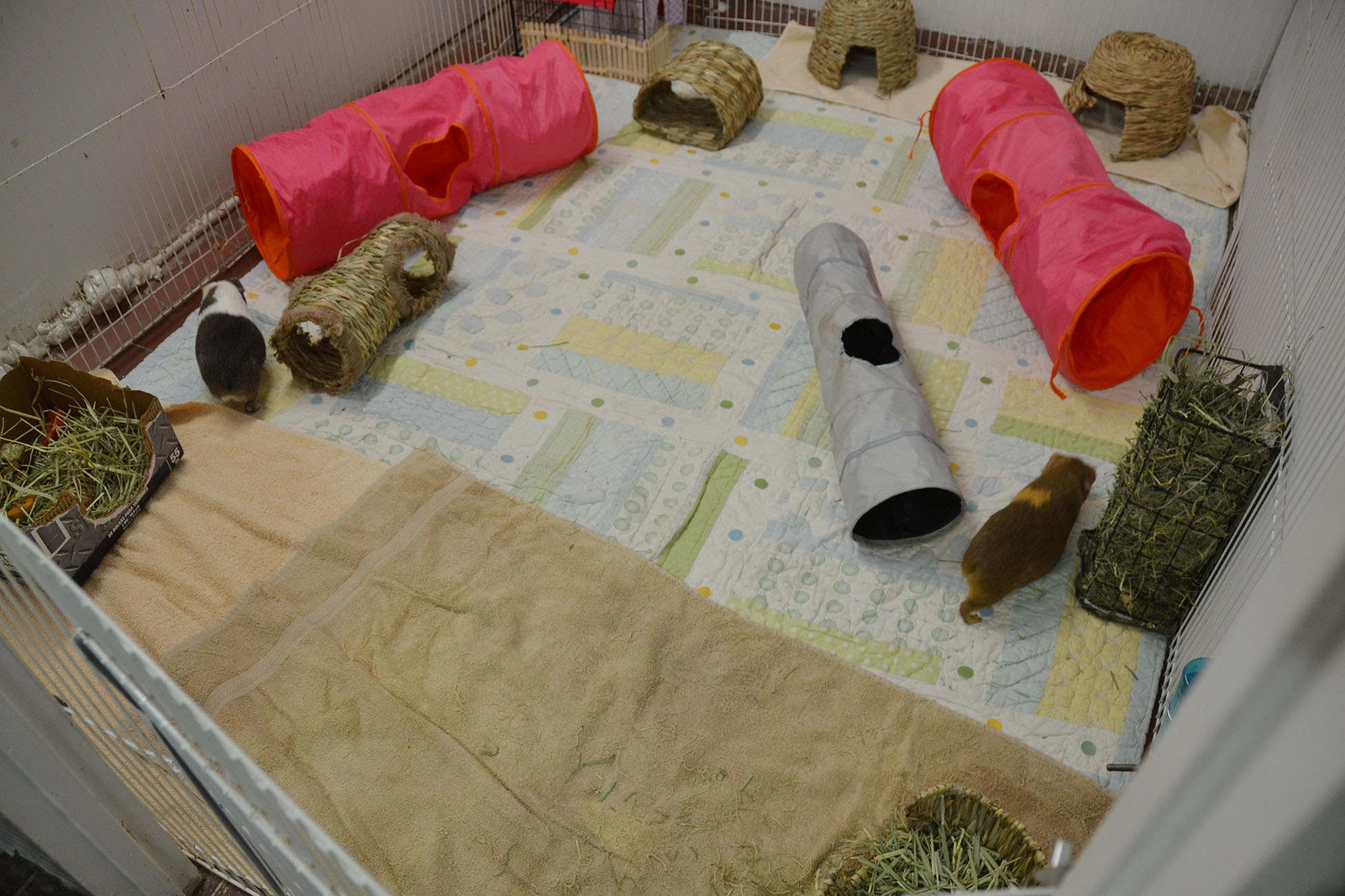 Place the enclosure in an area away from drafts or direct sunlight. It is also advisable to house the piggies in an open area rather than in a bedroom; housing them in a bedroom could disturb sleeping humans or lead to allergies due to the dust that bedding and/or hay often carry. Provide huts or boxes for the piggies to hide, as well as toys and soft surfaces for them to rest on. Make sure that there is no exposed metal where their feet can get caught and result in injury.
