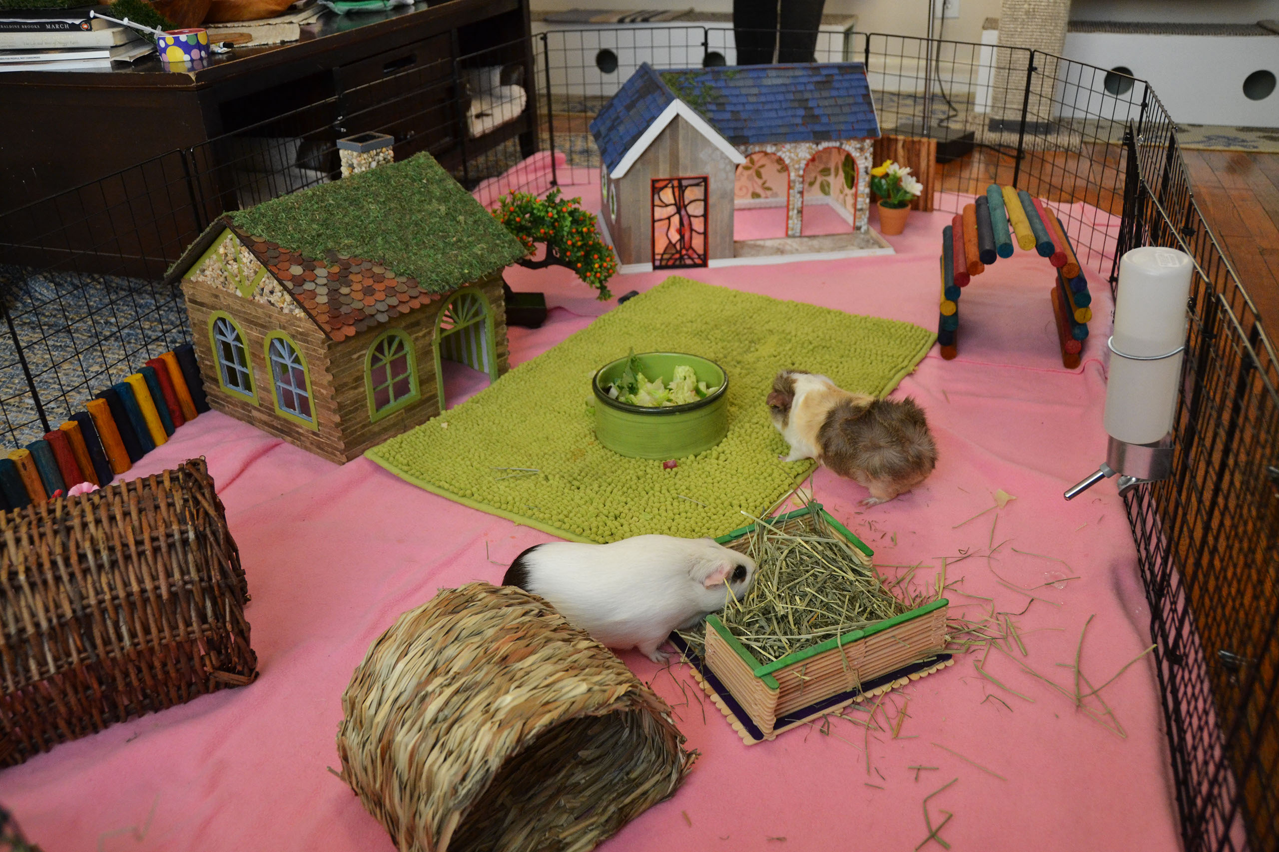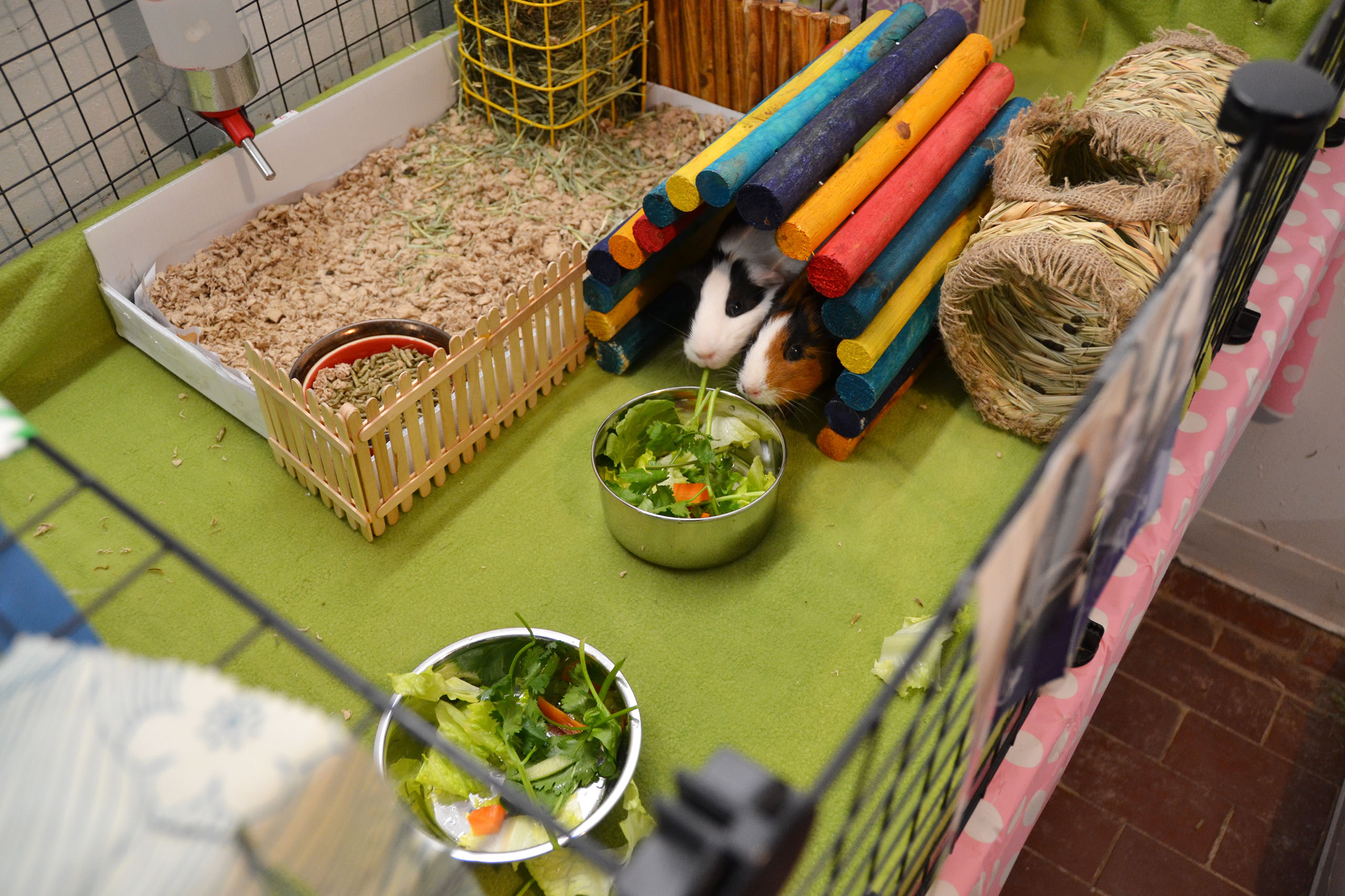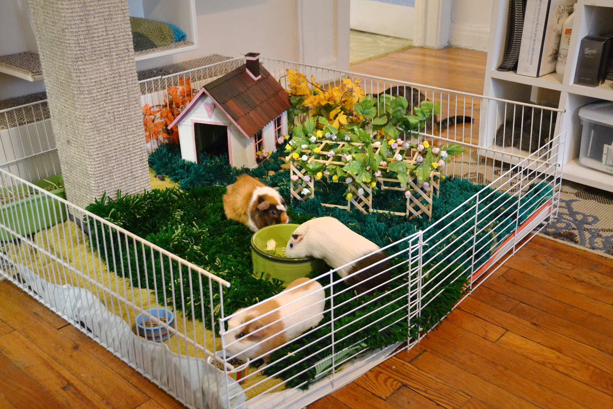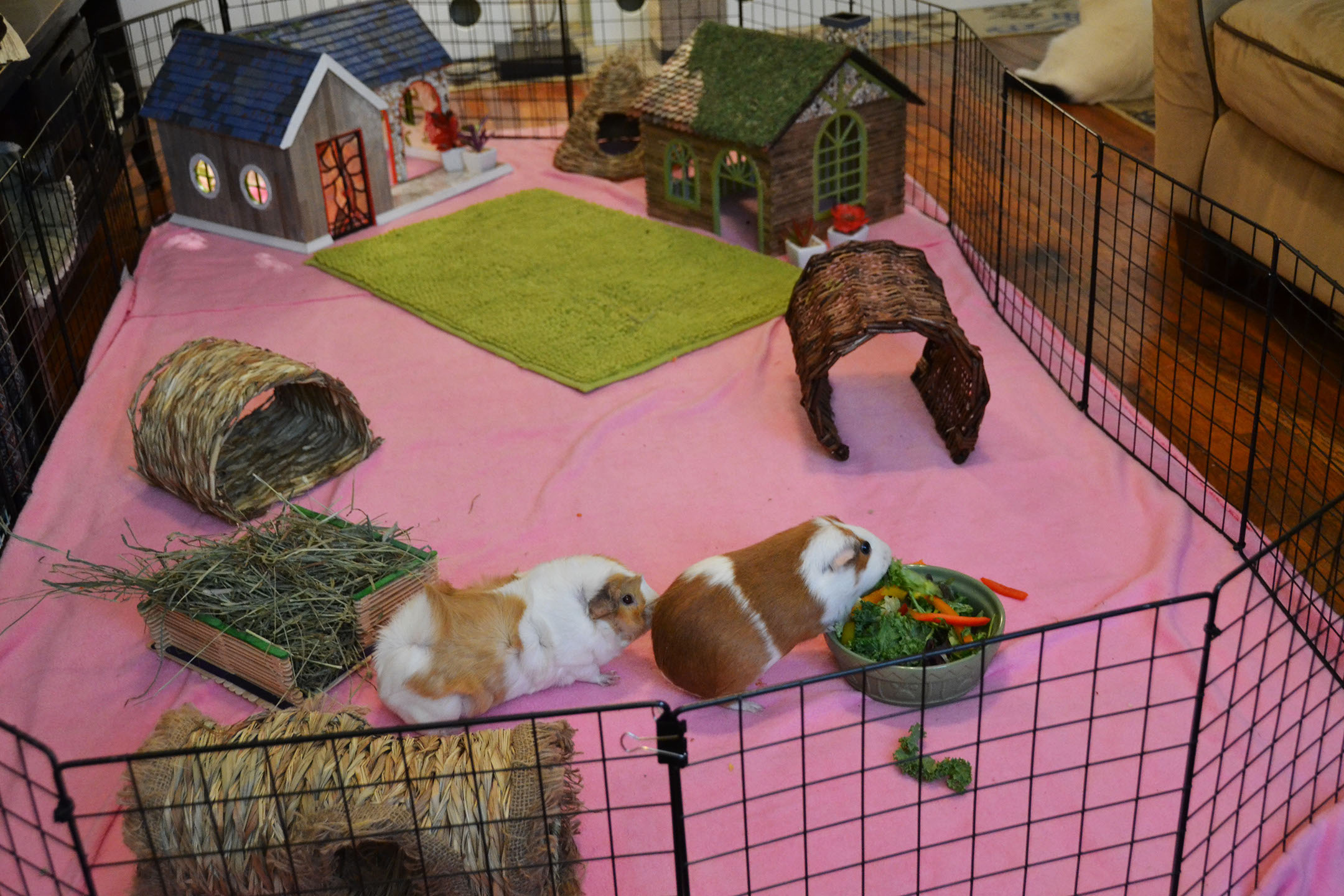 Place the enclosure in an area away from drafts or direct sunlight. It is also advisable to house the piggies in an open area rather than in a bedroom; housing them in a bedroom could disturb sleeping humans or lead to allergies due to the dust that bedding and/or hay often carry. Provide huts or boxes for the piggies to hide, as well as toys and soft surfaces for them to rest on. Make sure that there is no exposed metal where their feet can get caught and result in injury.